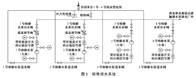 桐柏電站的檢修排水系統(tǒng),共設(shè)4臺排水泵,如圖1所示,1號、2號檢修水泵(大泵)用于排空引水隧洞、蝸殼、尾水管、尾水隧洞內(nèi)的水;3號、4號檢修水泵(小泵)用于球閥、上下庫閘門等的滲漏排水。每臺檢修水泵均配置逆止閥、壓力表和帶流量開關(guān)的示流信號器,在1號、2號水泵出水管處各安裝了一個流量調(diào)節(jié)閥。系統(tǒng)中共有2根總管,一根為水泵的總吸水管,包括從每臺機組尾水管底部至總管的支管,總吸水管和部分支管及管路上的操作閥門布置在廠房管路廊道中;另一根為總排水管,可將水排至滲漏集水井中,再經(jīng)滲漏排水泵排至下庫。