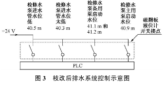 它結(jié)構(gòu)是利用旁通管的原理,主導(dǎo)管內(nèi)的液位和尾水管內(nèi)的液位高度一致,根據(jù)阿基米德定理,磁性浮子在液體中產(chǎn)生的浮力和重力平衡,當(dāng)尾水管中的水位升降時,液位計主導(dǎo)管內(nèi)的浮子也隨之升降,浮子內(nèi)的永久磁鐵通過磁耦合驅(qū)動指示器內(nèi)的翻板指示器,當(dāng)液位上升或下降時,翻板指示器由白色翻轉(zhuǎn)為紅色,或由原來的紅色翻轉(zhuǎn)為白色,指示器的顏色改變的高度就是被測水位的實際高度,從而實現(xiàn)液位的現(xiàn)場指示,以供運行人員目測尾水管的實時水位。安裝于液位計管壁外側(cè)的磁記憶開關(guān),可多點設(shè)置、滑動調(diào)整位置,提供了液位開關(guān)量報警功能。在裝置的頂部安裝了一個自動排氣裝置,當(dāng)主導(dǎo)管內(nèi)液位上升時能夠自動的排氣,下降時能夠按時補氣。現(xiàn)場安裝頂裝式磁翻板液位計時,裝置標(biāo)尺的0位,對應(yīng)的實地高程為EL.40.0m。浮子開關(guān)設(shè)定5個水位動作值,檢修水位低開關(guān)量報警值對應(yīng)的高程為40.3m;停止所有檢修水泵的開關(guān)量,所對應(yīng)的高程為40.5m;啟動主用檢修水泵的開關(guān)量,所對應(yīng)的高程為40.9m;啟動檢修水泵主用泵的開關(guān)量,以及要求手動啟動大泵,并作為水位高報警上送上位機,所對應(yīng)的高程為41.1m與41.2m,兩個開關(guān)量并列接入。全部開關(guān)量分別送入PLC,如圖3所示。