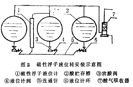 我廠頂裝式磁翻板液位計安裝,采用圖2的形式。三臺酸貯存槽②(三臺以上也可以)合用一臺液位計,每臺酸槽的出口與液位計,共連在一根連通管上⑤。要看某酸槽液位,開該酸槽通液位計的閥門④,液位即可醒目顯示。如此布置能節(jié)省兩臺液位計,價值四千余元(酸貯存槽數(shù)量越多,節(jié)約效果越大)。此外,在安裝時要注意:裝大浮子時重端向上;裝液位標(biāo)計(小浮標(biāo))時,紅色端向上,這樣可防止磁性相斥。裝完后用備用磁鋼,將小浮標(biāo)引到大浮子磁性材料處,顯示即可正常。目前頂裝式磁翻板液位計在我廠應(yīng)用情況良好。