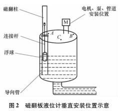 圖2中,B點靠近電機和泵,耐高溫磁翻板液位計安裝在此處既影響電機及泵的檢修,又因泵附近液位的環(huán)流波動較大,對浮子導(dǎo)向管沖刷嚴(yán)重,故B點不合理;C點處因有管道通過,不便維護且影響管道和泵、電機等的起吊更換,故也不能選擇C點;A點遠(yuǎn)離泵和電機,且有足夠的空間安裝翻板,便于維護,所以A點較為合適。