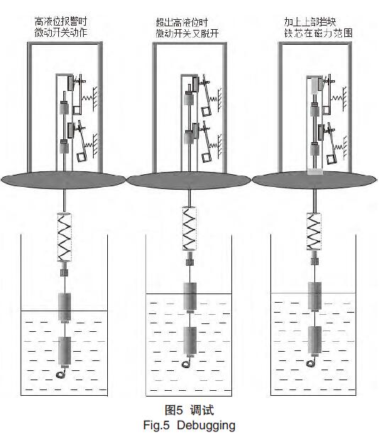 3)在調(diào)試過程中,發(fā)現(xiàn)液位開關(guān)沒有自保持功能,當高報警點過后,液位再往上升則高液位報警會消除,低液位時也是同樣,在分析原因后發(fā)現(xiàn),鐵芯在套筒內(nèi)移動的位置不當是造成不能自保持的原因,如圖5所示,于是在套筒內(nèi)的鐵芯上方加一阻擋塊,使高液位超出時,鐵芯被阻擋塊擋住,不再向上移動,從而不會脫出微動開關(guān)的磁力范圍,對低液位報警的自保持是在鐵芯的下部加一個環(huán)型的墊片,阻止鐵芯向下移動超出微動開關(guān)的磁力范圍。從而提高了可靠性和重復(fù)性。接下來的調(diào)試中,又出現(xiàn)了一些零零碎碎的問題,如磁鐵磁性不夠,或者彈簧彈性不夠,彈簧的抗疲勞性差。元器件的材料和加工工藝不理想,出于對核電的安全性和穩(wěn)定性的考慮,開始考慮使用國外公司的產(chǎn)品,在試用后沒有出現(xiàn)以上的問題,于是決定從新采購一批國外的液位開關(guān),將有問題的液位開關(guān)更換成國外的產(chǎn)品。