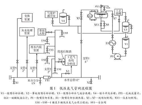 在煤化工領(lǐng)域,氮氣常常用于裝置中易燃易爆、有毒有害可燃性氣體的置換,或作為設(shè)備密封、保壓和儀表檢測元件的保護及動力氣源,對其含水量有較嚴格的要求,一般要求其含水量控制在2×10-6以下。若運行過程中發(fā)生了氮氣管網(wǎng)進水,會給全廠的安全生產(chǎn)造成威脅,冬季時管網(wǎng)甚至會出現(xiàn)結(jié)冰堵塞現(xiàn)象,導致氮氣管網(wǎng)癱瘓;當遇到突發(fā)情況系統(tǒng)需停車時,氮氣無法用于置換等工藝處理,更是會造成較大的安全隱患,甚至會引起設(shè)備損壞、著火、爆炸等惡性事故。因此,分析并解決氮氣管網(wǎng)進水的問題具有重要的意義。