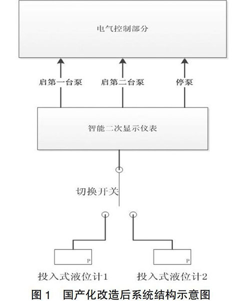如圖1所示,國產化改造后,地面排水控制系統(tǒng)用防凍液液位計測量地坑液位,用智能二次儀表接收防凍液液位計的信號,并根據(jù)設定的液位報警值向電氣控制部分發(fā)出啟動和停運排水泵信號,控制系統(tǒng)配置了2個防凍液液位計,通過1個轉換開關,可以選擇投入使用的液位計,也可對比兩個液位計的測量數(shù)據(jù),通過定期巡檢發(fā)現(xiàn)液位測量故障。
