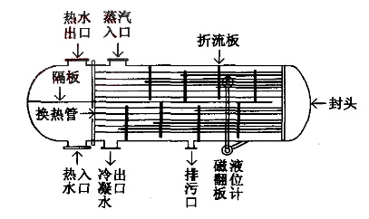 如下圖所示,壓力為0.4~0.6MPa的飽和蒸汽由蒸汽入口進(jìn)入管式換熱器,經(jīng)折流板、隔板上下流通,*終其大部分熱量被熱水吸收,形成凝結(jié)水從凝結(jié)水出口流出。一次熱水(溫度約為20℃)從熱水入口流進(jìn),經(jīng)過(guò)從左向右的換熱管流至封頭,在經(jīng)過(guò)從右向左的換熱管從熱水出口流出,變成二次熱水,二次熱水流向系統(tǒng),放熱后流回?fù)Q熱站循環(huán)水泵入口,經(jīng)加壓后再次流向熱水入口,如此反復(fù)循環(huán)加熱,*終向用戶(hù)提供80~130℃的高溫?zé)崴?/div>