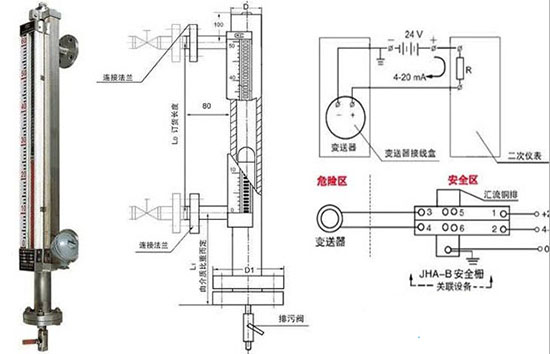 液體液位計是以浮子內(nèi)磁鋼驅(qū)動雙色薄片的翻轉(zhuǎn)來指示液位的一種新型儀表,主體不銹鋼內(nèi)腔管中磁浮子隨液位的升降而上下運(yùn)動,同時驅(qū)使主體外指示器內(nèi)的雙色薄片翻轉(zhuǎn),有液位時轉(zhuǎn)示紅色、無液位時顯示白色。液體液位計以紅色和白色色帶間的界線即代表液位高度。在指示器左側(cè)配有醒目的刻度標(biāo)尺,從而使液位的指示顯得更加清晰。不僅可以實現(xiàn)現(xiàn)場就地觀測,也可以加裝遠(yuǎn)傳裝置實現(xiàn)遠(yuǎn)程監(jiān)控及報警等功能。