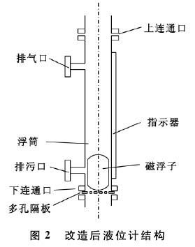 (3)方案3。改造現(xiàn)有的液位計,采用上下端日連接,上過程進日改為排氣口,下過程進日改為排污口,原安裝浮子法鑄和排氣閥接日改為連通日,在下部增加一個多孔隔板,保證浮子不進人工藝管線,同時保證液體的正常流動。在保證不改變液位計結(jié)構(gòu)情況下,將液位計與工藝管線連接。此方案優(yōu)點是花費少,不閑置設備,并且還能達到液位計與管線清理同步,實現(xiàn)維修與檢修同步。