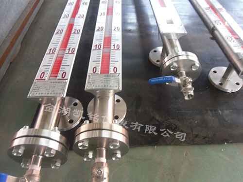 液位計根據(jù)浮力原理,浮子在測量管內(nèi)隨液位的升降而上下移動,浮子內(nèi)的永久磁鋼通過磁耦合作用,驅(qū)動紅、白色翻柱翻轉(zhuǎn)180’液位上升時,翻柱由白色轉(zhuǎn)為紅色,下降時,翻柱由紅色轉(zhuǎn)為白色,從而實現(xiàn)液位的指示。