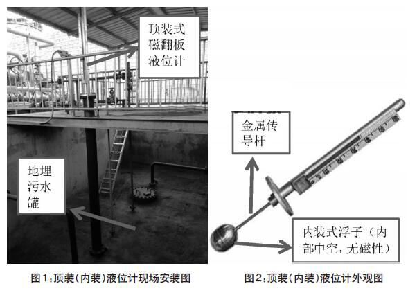 該區(qū)塊集氣站使用的是地埋污水罐,主要作用是對(duì)集氣站內(nèi)生產(chǎn)污水進(jìn)行沉降。在運(yùn)行過(guò)程中,帶報(bào)警磁翻板液位計(jì)故障導(dǎo)致顯示數(shù)據(jù)不準(zhǔn),一方面對(duì)污水液位情況掌握不準(zhǔn)確,另一方面會(huì)出現(xiàn)不安全因素,甚至安全事故。該井區(qū)地埋污水罐使用的液位計(jì)為頂裝式磁翻板(磁浮子)液位計(jì),根據(jù)液位計(jì)磁性材質(zhì)所在位置的不同帶報(bào)警磁翻板液位計(jì)也稱為內(nèi)裝式磁翻板液位計(jì)。