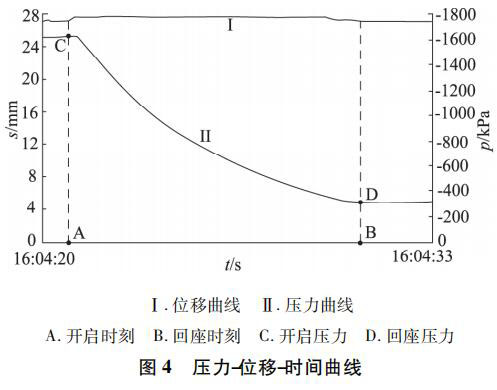 運用安全閥冷態(tài)試驗裝置對該立式儲罐液位計進行動作性能試驗,將試驗容器內(nèi)的介質(zhì)壓力卸放到整定壓力以下,開啟試驗容器和安全閥進口端的球閥,關閉流量計管路閥門,開啟主測試管路截止閥,開啟儲氣容器通向試驗容器的節(jié)流閥,逐漸加壓,同時啟動計算機數(shù)據(jù)采集系統(tǒng),被試安全閥開啟,繼續(xù)升高壓力,直至被試安全閥保持全開啟( 排放) 狀態(tài),然后關閉儲氣容器通向試驗容器的閥門,被試安全閥亦逐漸關閉。計算機自動生成試驗過程的壓力、位移曲線,試驗人員記錄采集開啟壓力、排放壓力、回座壓力、開啟高度等數(shù)據(jù)。重復上述試驗至少 3 次,得到相應壓力-位移-時間曲線,見圖 4。左縱坐標為位置,右縱坐標為壓力,其中上部曲線代表導閥位移,下部曲線代表壓力變化。當導閥位置發(fā)生變化,代表導閥開始開啟動作,此時的壓力為該立式儲罐液位計的開啟壓力,即整定壓力; 當導閥位置回到原點代表導閥已經(jīng)回座,此時對應的壓力即為回座壓力。