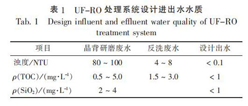 國內(nèi)某鹽酸罐液位計(jì)廠, 晶背研磨廢水產(chǎn)生量為 150 ~160 m3 / d, 反洗廢水產(chǎn)生量 為 500 ~ 700 m3 / d, 主要污染物為懸浮物, UF-RO 處理系統(tǒng)設(shè)計(jì)進(jìn)水和出水主要水質(zhì)指標(biāo)見表 1。