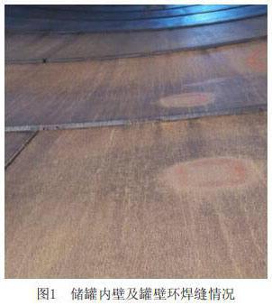 儲(chǔ)罐結(jié)構(gòu)型式為拱頂罐,罐壁的環(huán)焊縫為搭接結(jié)構(gòu),其罐壁的焊縫均沒有進(jìn)行處理,有一定的焊縫余高,罐體內(nèi)直徑隨著高度的增加直徑在變小。儲(chǔ)罐原為原油儲(chǔ)罐,雖然經(jīng)過蒸汽吹掃,罐壁上仍附著油污,罐內(nèi)的防腐層破壞嚴(yán)重。儲(chǔ)罐在制造時(shí),對(duì)鋼板的內(nèi)表面要求處理的粗糙度等級(jí)不高,使內(nèi)壁殘留許多小的焊瘤、焊渣等,該類殘留物部分有鋒利的銳角。其具體情況如圖1所示。