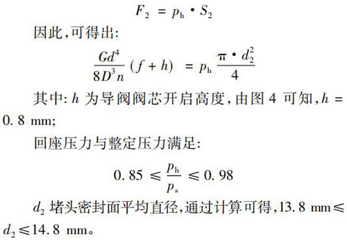 當(dāng)系統(tǒng)壓力降低到回座壓力時,導(dǎo)閥彈簧要克服堵頭密封面處的密封力將其打開,此時應(yīng)滿足: