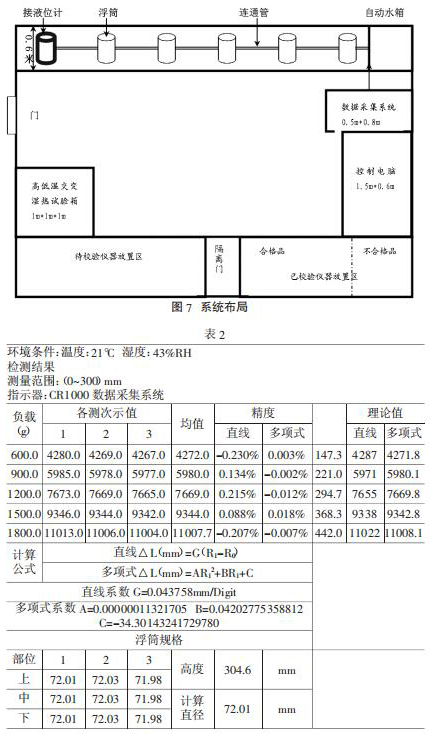 在本率定系統(tǒng)中,采用磁致伸縮式高精度液氯液位計,精度為±0.01mm。采用高低溫交變濕熱試驗箱進行溫度傳感器率定。數(shù)據(jù)采集系統(tǒng)為美國坎貝爾 CR1000 自動數(shù)據(jù)采集系統(tǒng),通過控制電腦,將設定好的頻率裝載入采集系統(tǒng),自動加水和放水以及數(shù)據(jù)采集,同時數(shù)據(jù)自動保存和計算。