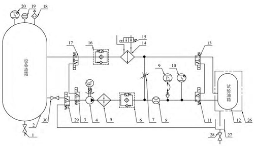 油液供油:原理中油液經(jīng)吸油開(kāi)關(guān)(30)、L 形三通電動(dòng)閥(3、29)、油泵(4)、加熱器(5)、供油過(guò)濾器(6)、流量計(jì)(8)、L 形三 通 電 動(dòng) 閥(11)后進(jìn)入被測(cè)油箱,然后 經(jīng) L形三通電動(dòng)閥(13)、油水換熱器(14)、回油過(guò)濾器(16)、L 形三通電動(dòng)閥回到設(shè)備油箱中,此條支路可提供被測(cè)油箱剛安裝于試驗(yàn)臺(tái)上時(shí)的油液供給,通過(guò)流量計(jì)軟件計(jì)時(shí)的方法判斷補(bǔ)油量。
