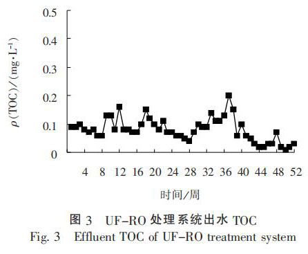 經(jīng)過 1 年的連續(xù)運行, 晶背研磨廢水進水 TOC質(zhì)量濃度為 0.5 ~ 5.0 mg / L, 濁度為 80 ~ 100 NTU,SiO2 質(zhì) 量 濃 度 為 2 ~ 4 mg / L, 反 洗 廢 水 進 水 TOC質(zhì) 量 濃 度 為 1.5 ~ 3.0 mg / L, 濁 度 為 4 ~ 8 NTU,UF-RO 處理出水 TOC 質(zhì)量濃度低于 1 mg / L, 濁度低于 0.1 mg / L, SiO2 質(zhì) 量 濃 度 低 于 1 mg / L, 完 全可以回用至超純水預(yù)處理系統(tǒng)。 UF-RO 處理系統(tǒng)出水電導(dǎo)率和 TOC 濃度見圖 2 ~ 圖 3。