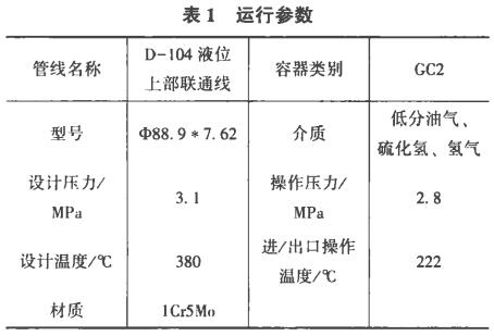 該裝置于2016年9月開工轉(zhuǎn)人正常運(yùn)行,2016年9月7日發(fā)現(xiàn)D-104液面計(jì)上引出線有冒油氣現(xiàn)象,現(xiàn)場檢查發(fā)現(xiàn)D-104液面計(jì)上接管引出線法蘭后焊縫靠上部有裂紋現(xiàn)象,車間對泄漏部位進(jìn)行帶壓鉚擊消漏處理。9月8日該部位再次出現(xiàn)泄漏,裝置停工隔離處理(表1)。