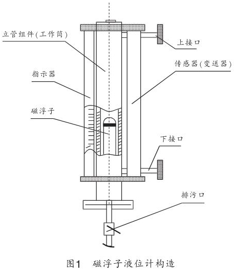 遠(yuǎn)傳式高溫渣油液位計由磁浮子、工作筒、指示器、遠(yuǎn)傳變送器組成,如圖 1 所示。