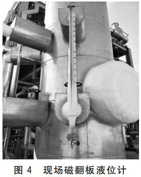 現(xiàn)場磁翻板液位計(jì)(圖4)由于儲罐壓力偏高,正常生產(chǎn)時(shí)為3MPa,導(dǎo)致磁翻版液位計(jì)浮子被壓扁。解決方法:尋找能夠生產(chǎn)耐高壓低密度液位計(jì)浮子廠家。