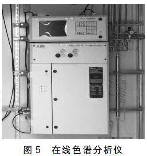 (1)利用電加熱氣化取樣探頭,把測量介質(zhì)引入在線色譜分析儀,實(shí)時(shí)分析氣體組分。在使用在線色譜分析儀(圖5)時(shí),需要配合標(biāo)氣及載氣,提前對色譜進(jìn)行標(biāo)定。預(yù)處理部分,先把每個(gè)取樣管路取下來吹掃5~10min(取樣探頭壓力設(shè)定為2~3kg),保證沒有雜質(zhì)摻入,然后接上管線。要注意定期檢查色譜載氣(H2或者N2)使用情況,及時(shí)更換。如果更換不及時(shí),在使用完之前,*好停用色譜,防止燒壞檢測器。