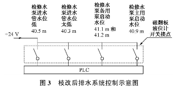 它結(jié)構(gòu)是利用旁通管的原理,主導(dǎo)管內(nèi)的液位和尾水管內(nèi)的液位高度一致,根據(jù)阿基米德定理,磁性浮子在液體中產(chǎn)生的浮力和重力平衡,當(dāng)尾水管中的水位升降時,液位計主導(dǎo)管內(nèi)的浮子也隨之升降,浮子內(nèi)的永久磁鐵通過磁耦合驅(qū)動指示器內(nèi)的翻板指示器,當(dāng)液位上升或下降時,翻板指示器由白色翻轉(zhuǎn)為紅色,或由原來的紅色翻轉(zhuǎn)為白色,指示器的顏色改變的高度就是被測水位的實際高度,從而實現(xiàn)液位的現(xiàn)場指示,以供運行人員目測尾水管的實時水位。安裝于液位計管壁外側(cè)的磁記憶開關(guān),可多點設(shè)置、滑動調(diào)整位置,提供了液位開關(guān)量報警功能。在裝置的頂部安裝了一個自動排氣裝置,當(dāng)主導(dǎo)管內(nèi)液位上升時能夠自動的排氣,下降時能夠按時補氣?,F(xiàn)場安裝耐高溫磁翻板液位計時,裝置標(biāo)尺的0位,對應(yīng)的實地高程為EL.40.0m。浮子開關(guān)設(shè)定5個水位動作值,檢修水位低開關(guān)量報警值對應(yīng)的高程為40.3m;停止所有檢修水泵的開關(guān)量,所對應(yīng)的高程為40.5m;啟動主用檢修水泵的開關(guān)量,所對應(yīng)的高程為40.9m;啟動檢修水泵主用泵的開關(guān)量,以及要求手動啟動大泵,并作為水位高報警上送上位機,所對應(yīng)的高程為41.1m與41.2m,兩個開關(guān)量并列接入。全部開關(guān)量分別送入PLC,如圖3所示。