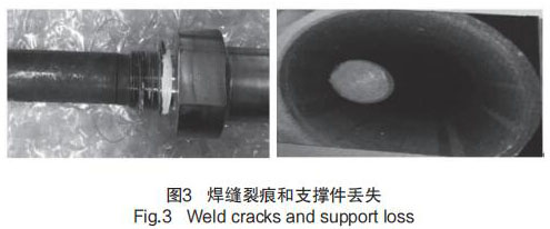 在歷次大修執(zhí)行 GSS 系統(tǒng) MSR 食用油液位計(jì)預(yù)防性維修檢查時發(fā)現(xiàn),部分導(dǎo)波桿支撐件破碎并丟失,同時存在探桿根部焊縫有裂痕的問題,見圖 3 焊縫裂痕和支撐件丟失。