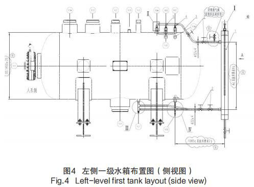 1)在每個疏水箱外部靠近水側(cè)取壓口處,安裝 3 個測量筒用于導(dǎo)波食用油液位計(jì)的安置以及液位測量;每個測量筒的汽側(cè)取壓口仍然選用原導(dǎo)波食用油液位計(jì)接口,而水側(cè)取壓口引用原水汽取樣口、磁翻板液位計(jì)取壓口,以左側(cè)一級水箱布置圖為例,見圖 4 左側(cè)一級水箱布置圖(側(cè)視圖)。
