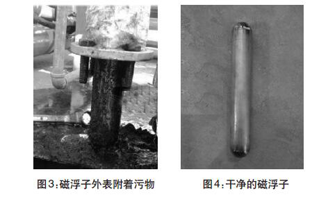 經(jīng)過兩年多運行,污水罐內(nèi)可能沉淀污泥雜質(zhì)導(dǎo)致液位計示數(shù)不準(zhǔn)。現(xiàn)場拆卸液位計,并且對浮球和磁浮子進(jìn)行清洗。(圖3-圖4)