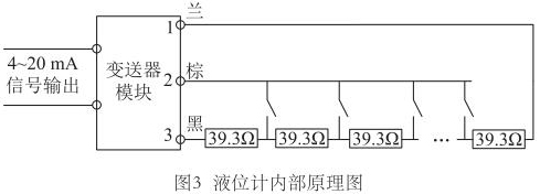 為尋求更好的改進(jìn)方案,對蒸汽夾套型磁翻板液位計的測量原理進(jìn)行了深入研究。液位計測量桿中是由等間距排布的干簧管和電阻元件組成,當(dāng)磁浮子達(dá)到某一高度時,對應(yīng)的干簧管閉合,如果能識別出哪個干簧管閉合,即可獲得當(dāng)前液位值。那么變送器又是如何識別出哪個干簧管閉合的呢?再次探究測量桿內(nèi)部電路,繪制液位計內(nèi)部原理圖,如圖3所示。測量桿內(nèi)部電阻串聯(lián)連接,每兩個電阻的連接處連接干簧管的一端,干簧管的另一端并聯(lián)連接,*終引出蘭、棕、黑三根信號線。