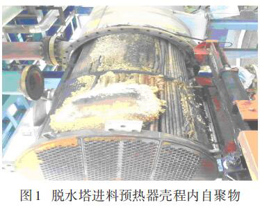 (1)脫水塔進(jìn)料熱交換器和塔頂冷凝器內(nèi)生成大量自聚物的主要原因是浮頭式換熱器結(jié)構(gòu)復(fù)雜,設(shè)備死角多;丁二烯走殼程,流速慢,會(huì)使丁二烯在高溫環(huán)境下停留過(guò)長(zhǎng),發(fā)生自由基聚合反應(yīng)。解決辦法是將 2 臺(tái)換熱器由浮頭式改為固定管板式換熱器,并將丁二烯含量較高的塔頂氣改為管程。一方面換熱器結(jié)構(gòu)較為簡(jiǎn)單無(wú)死角;另一方面走管程流速快,減少了丁二烯停留時(shí)間。