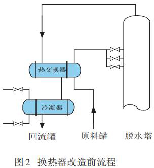 冷凝器換熱面積由 367.8 m2改為 344 m2,管程塔頂氣壓力降小于 10 kPa,換熱能力與原設(shè)備相同;進(jìn)料預(yù)熱器換熱面積由 260.3 m2改為 344 m2,管程塔頂氣壓力降及循環(huán)水流速均在合理范圍內(nèi),均滿足裝置操作彈性要求,換熱器改造前、后的流程分別見(jiàn)圖2,3。