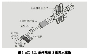 南10站試用磁致伸縮液位計類型為ACD-1DL系列,該類型液位計主要傳輸部分為:波導(dǎo)絲、浮子磁環(huán)、永久磁環(huán)、傳輸部分及檢測機構(gòu)等部分組成。傳感器的電路在波導(dǎo)絲上激勵出脈沖電流,該電流沿波導(dǎo)絲傳播時會在波導(dǎo)絲的周圍產(chǎn)生脈沖電流磁場。脈沖電流磁場與浮子產(chǎn)生的磁場相遇,在相遇空間產(chǎn)生一個扭轉(zhuǎn)波脈沖,脈沖沿波導(dǎo)絲傳回并由檢出機構(gòu)檢出,通過測量脈沖電流與扭轉(zhuǎn)波的時間差可以精確地確定浮子所在液面位置。