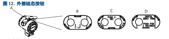 使用位于頂部銘*下、三組可能的外部組態(tài)按鈕中某一組進(jìn)行零點(diǎn)調(diào)校。為了操作組態(tài)按鈕,需要松開螺釘,滑動(dòng)變送器頂部的銘*。參照?qǐng)D 10 來確認(rèn)功能。