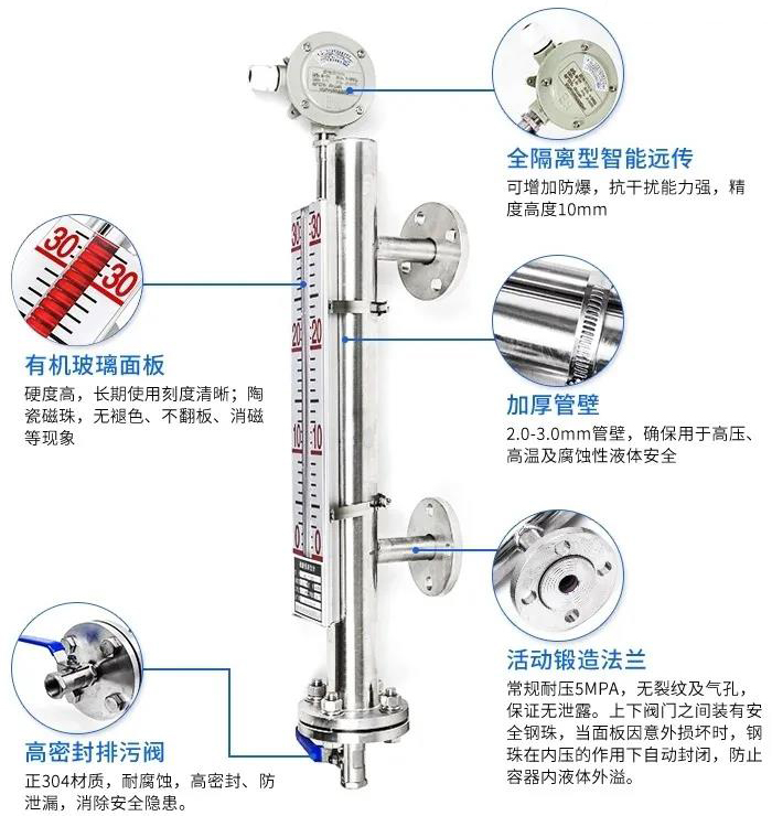 磁性液位計是根據(jù)連通器和帶磁藕合基本原理而工作中的。做為一種普遍的液位儀檢測儀表,被普遍用于石油化工設(shè)備、倉儲物流運送等制造行業(yè)對各種各樣儲槽、儲罐、球形器皿和加熱爐等機器設(shè)備內(nèi)的物質(zhì)開展液位儀檢驗。相關(guān)磁性液位計的基本原理,大家都廣為人知,但對其構(gòu)造和特性卻了解很少。那麼,磁性液位計的構(gòu)造構(gòu)成和特性有什么呢?