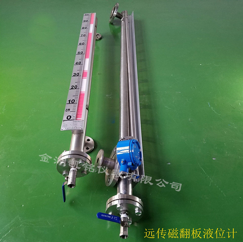 在桶槽外側(cè)裝置延伸旁路管,由旁路管外加裝液位指示器,將裝有磁鐵的浮球放進(jìn)旁路管內(nèi),因磁性色片內(nèi)裝著與浮球磁性相反之磁鐵,所以當(dāng)浮球上升時會吸引磁性色片翻動,磁性色片顏色會由白色翻為紅色(或銀色翻為金色),以指示實(shí)際液面高度。
