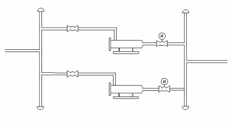 在輸氣站場(chǎng)根據(jù)下游用戶年設(shè)計(jì)輸氣量及檢維修需求通常設(shè)置兩臺(tái)臥式過(guò)濾分離器,運(yùn)行時(shí)通常采用一用一備方式運(yùn)行,氣量需求高峰時(shí)段達(dá)到單臺(tái)處理量時(shí)兩臺(tái)同時(shí)運(yùn)行以滿足用戶氣量需求。過(guò)濾分離器在整個(gè)輸氣站場(chǎng)工藝流程中通過(guò)法蘭與管道相連,同時(shí)上下游均設(shè)置球閥(見(jiàn)圖1),其中下游球閥與電動(dòng)執(zhí)行機(jī)構(gòu)相匹配使用,能實(shí)現(xiàn)遠(yuǎn)程開(kāi)關(guān)控制。在正常運(yùn)行狀態(tài)下,在用過(guò)濾分離支路的上下游球閥處于完全開(kāi)啟狀態(tài),備用過(guò)濾分離支路的上游球閥處于開(kāi)啟狀態(tài),下游球閥處于關(guān)閉狀態(tài)。對(duì)于過(guò)濾分離器切換有兩種方式:一種是手動(dòng)模式,另一種是自動(dòng)模式。在手動(dòng)模式下可由操作人員通過(guò)遠(yuǎn)程和就地狀態(tài)下實(shí)現(xiàn)過(guò)濾支路流程切換;當(dāng)在自動(dòng)模式下電動(dòng)閥產(chǎn)生事故關(guān)斷時(shí),則報(bào)警并自動(dòng)選擇備用設(shè)備,打開(kāi)備用支路的電動(dòng)閥,關(guān)閉當(dāng)前支路的電動(dòng)閥門,實(shí)現(xiàn)工作分離器和備用分離器的切換,上述過(guò)程由程序自動(dòng)完成,不需人為干預(yù)。