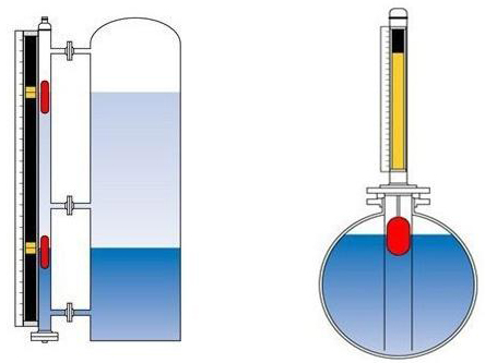 在桶槽外側(cè)裝置延伸旁路管,由旁路管外加裝液位指示器,將裝有磁鐵的浮球放進(jìn)旁路管內(nèi),因磁性色片內(nèi)裝著與浮球磁性相反之磁鐵,所以當(dāng)浮球上升時(shí)會(huì)吸引磁性色片翻動(dòng),磁性色片顏色會(huì)由白色翻為紅色(或銀色翻為金色),以指示實(shí)際液面高度。