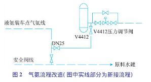 1)將液氨裝車氣氨返回線由進(jìn)酸性水中間罐改為進(jìn)氨氣分液罐V4412。以前,氣氨返回線至酸性水中間罐,由于液氨裝車時(shí)有大量氣氨返回原料水中間罐,氣氨不能及時(shí)吸收、溶解,造成原料水中間罐(V4410或V5407)壓力上升,水封被破壞,罐內(nèi)氣體外逸,形成安全環(huán)保隱患。為減少原料水罐氣氨返回量,在大檢修期間,增加了氣氨至V4412入口管線流程(氨壓機(jī)入口)。具體流程見圖2。
