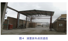 4)液氨裝車點(diǎn)移位改造。液氨裝車點(diǎn)不規(guī)范。根據(jù)相關(guān)要求,液氨裝車時(shí),周圍不能有機(jī)動(dòng)車通行,但液氨裝車點(diǎn)位于14號(hào)馬路西側(cè)5m處,對(duì)車輛及施工人員并無法完全封閉,裝車存在很大的安全風(fēng)險(xiǎn)。以前,液氨裝車由汽提崗位外操負(fù)責(zé),由于外操工作繁忙,造成液氨裝車過程的監(jiān)督時(shí)斷時(shí)續(xù),為解決這一隱患,車間指派專人負(fù)責(zé)監(jiān)管液氨裝車的全過程。監(jiān)管人員不但要檢查接頭有無泄漏,還要核實(shí)駕駛員和押運(yùn)員的資質(zhì)。車間根據(jù)液氨裝車的實(shí)際情況,編制《液氨裝車泄漏應(yīng)急操作卡》、《液氨裝車操作規(guī)程》,以便進(jìn)一步規(guī)范液氨裝車操作程序。應(yīng)分開設(shè)置液氨裝卸站的進(jìn)出口,當(dāng)進(jìn)出口合用時(shí),站內(nèi)應(yīng)設(shè)回車場(chǎng)。由于液氨裝車點(diǎn)東側(cè)5m處就是煉油區(qū)雨排系統(tǒng),為了解決液氨裝車過程泄漏噴淋水污染公司煉油區(qū)雨排系統(tǒng),在裝車點(diǎn)東西側(cè)各增設(shè)圍堰。從圖4可以看出:液氨裝車點(diǎn)改造后,現(xiàn)場(chǎng)更為規(guī)范,管理更為嚴(yán)格。