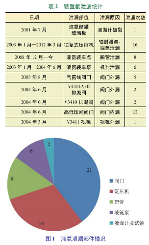 根據(jù)裝置長期運(yùn)轉(zhuǎn)紀(jì)錄,泄漏部位的統(tǒng)計(jì)情況列于表2。液氨泄漏部件占比見圖1。