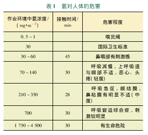 氨氣是一種無色透明而具有刺激性氣味的氣體,*易溶于水成為氨水(又稱氫氧化銨),呈弱堿性,1%水溶液pH值11.7。氨易液化,經(jīng)壓縮后成為液氨。根據(jù)衛(wèi)法監(jiān)發(fā)(2003)142號(hào)《高毒物品目錄》,氨氣屬于2.3類高毒氣體,8類腐蝕品,火災(zāi)爆炸危險(xiǎn)性類別為乙A類。氨與空氣混合到一定比例時(shí),遇明火能引起爆炸,其爆炸*限(體積分?jǐn)?shù))為15.5%~25%。低濃度氨對(duì)粘膜有刺激作用。高濃度氨可引起組織溶解性壞死、皮膚及上呼吸道粘膜化學(xué)性炎癥及燒傷、肺充血、肺水腫及出血等。常易發(fā)生輕度、重度中毒。外露皮膚可出現(xiàn)II度化學(xué)灼傷。氨對(duì)人體的危害見表1。
