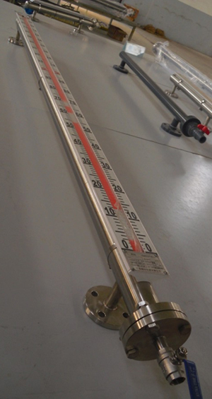 根據(jù)浮力原理,浮子在測(cè)量管內(nèi)隨液位的升降而上、下移動(dòng),浮子內(nèi)的永久磁鋼通過(guò)耦合作用,驅(qū)動(dòng)紅、白色翻柱翻轉(zhuǎn)180°,液位上升時(shí)翻柱由白色轉(zhuǎn)為紅色,下降時(shí)由紅色轉(zhuǎn)為白色,從而實(shí)現(xiàn)液位指示。